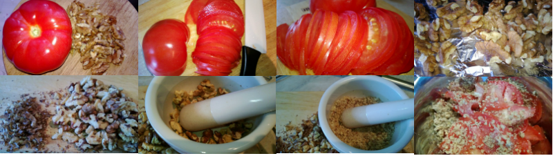 Алгоритм приготовления: помидор замочить. Грецкие орехи запечь 10 мин в духовке. Очистить орехи от шелухи и натолочь в ступке. Помидор тонко порезать острым ножом. Все смешать со специями, солью и маслом.